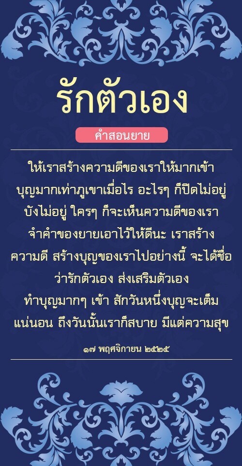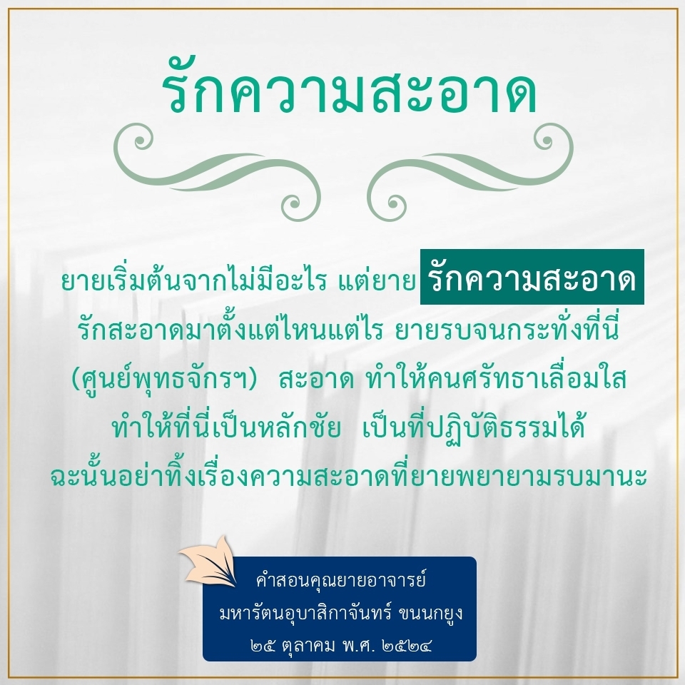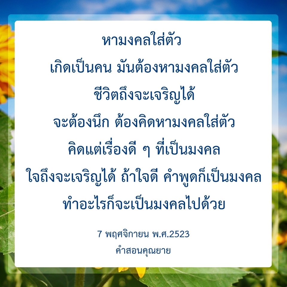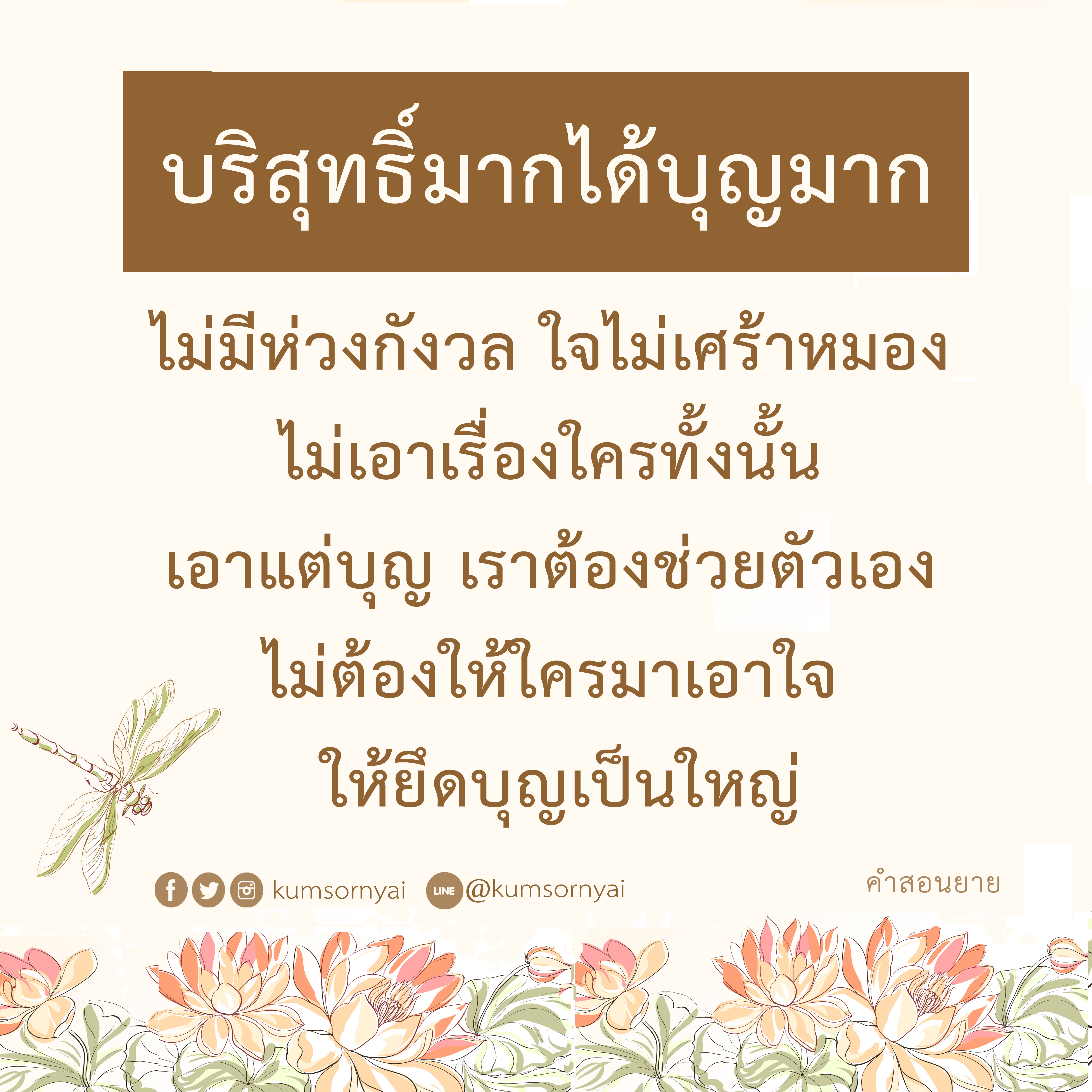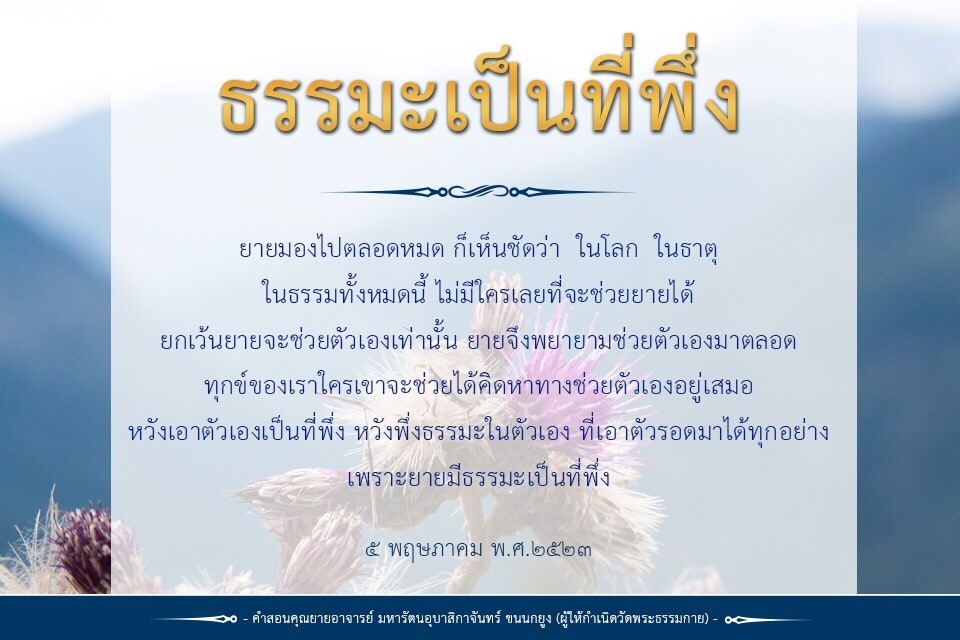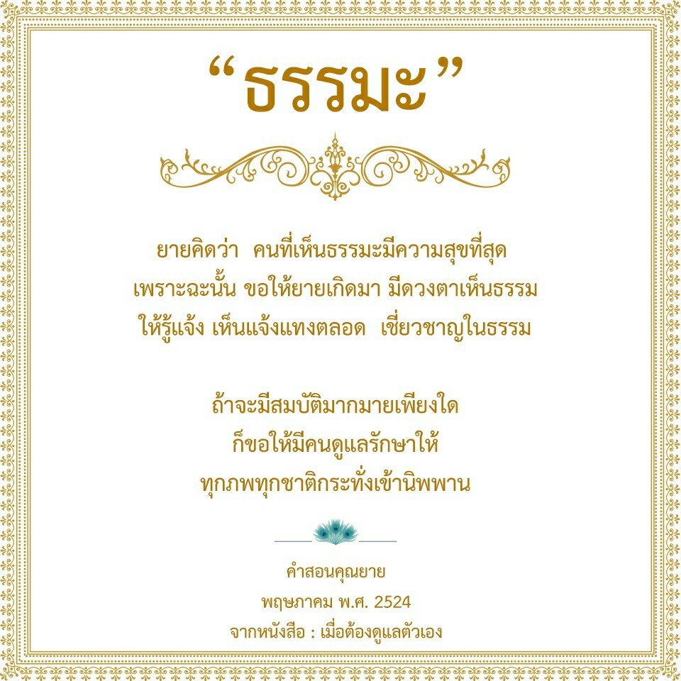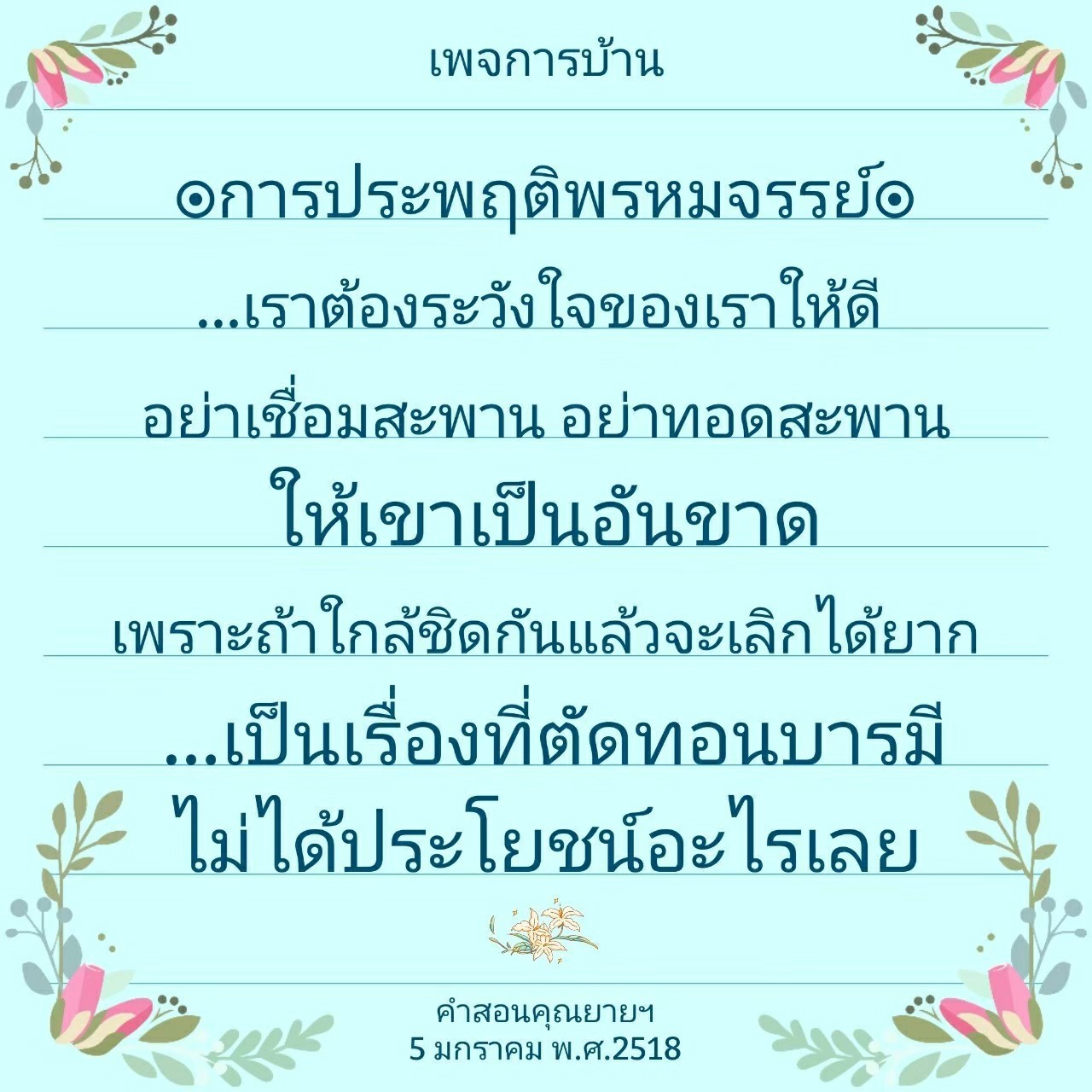 | As I converse with various people, I keep my mind always in its purified state, always centered in merit and in Dhamma. No greed, anger, nor delusions are allowed to defile me.