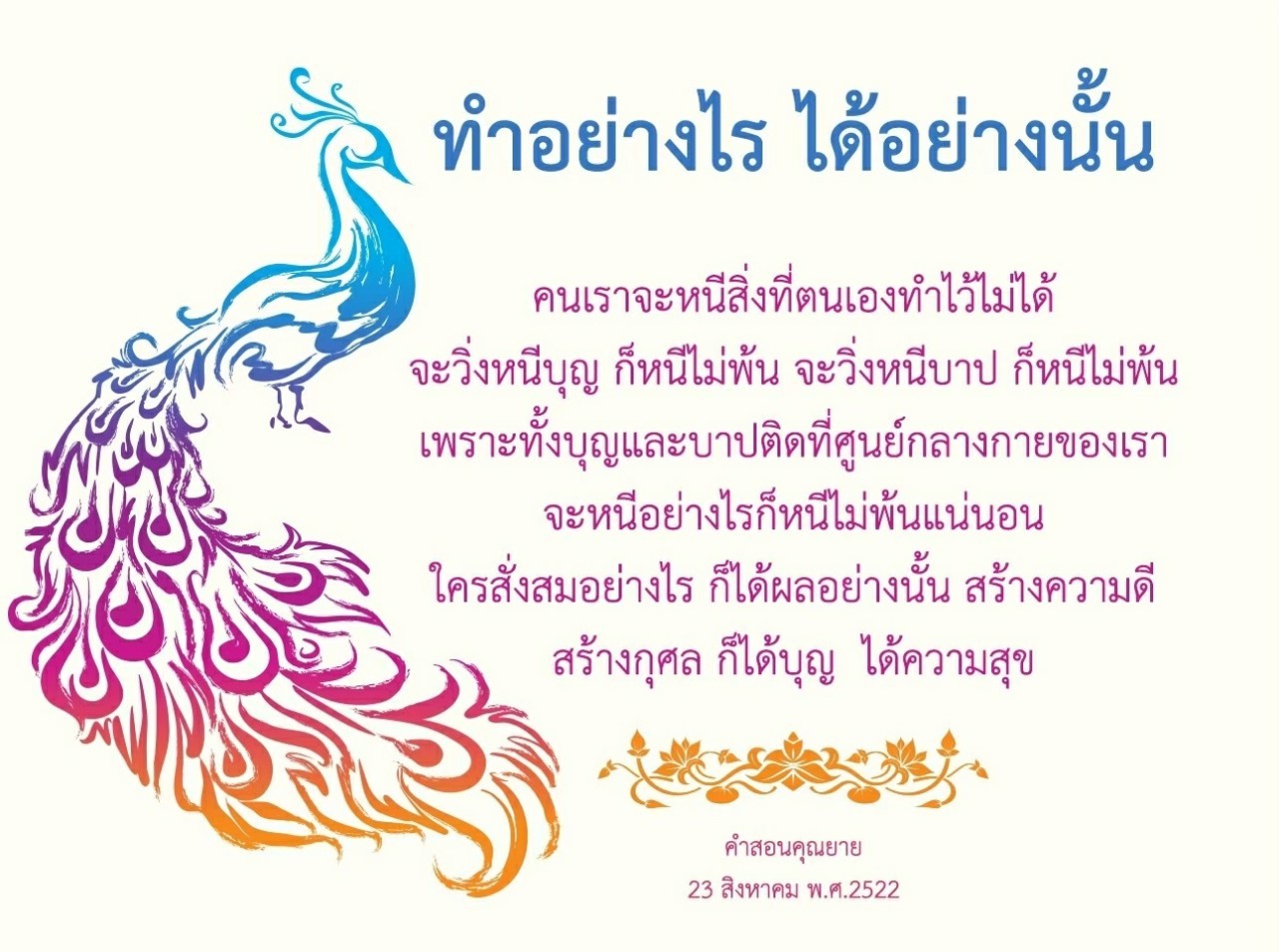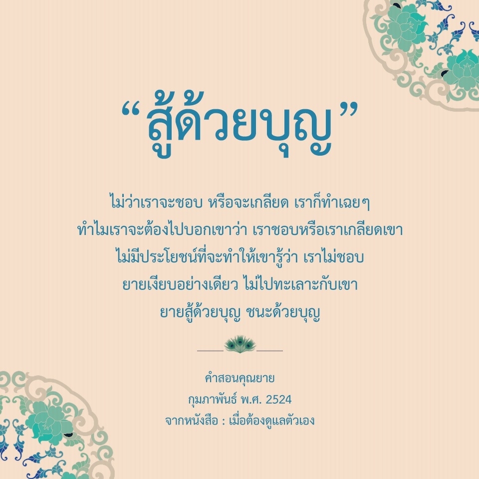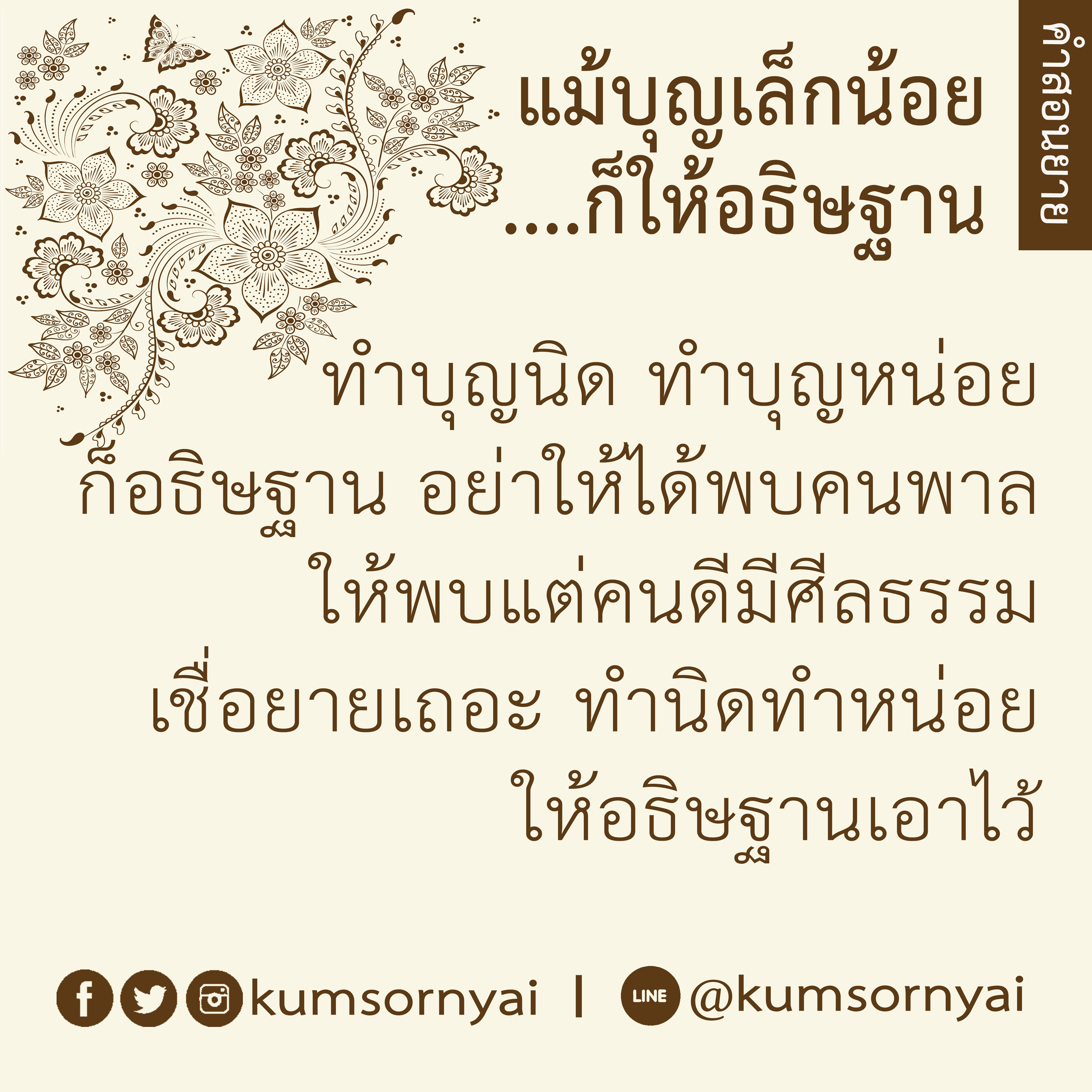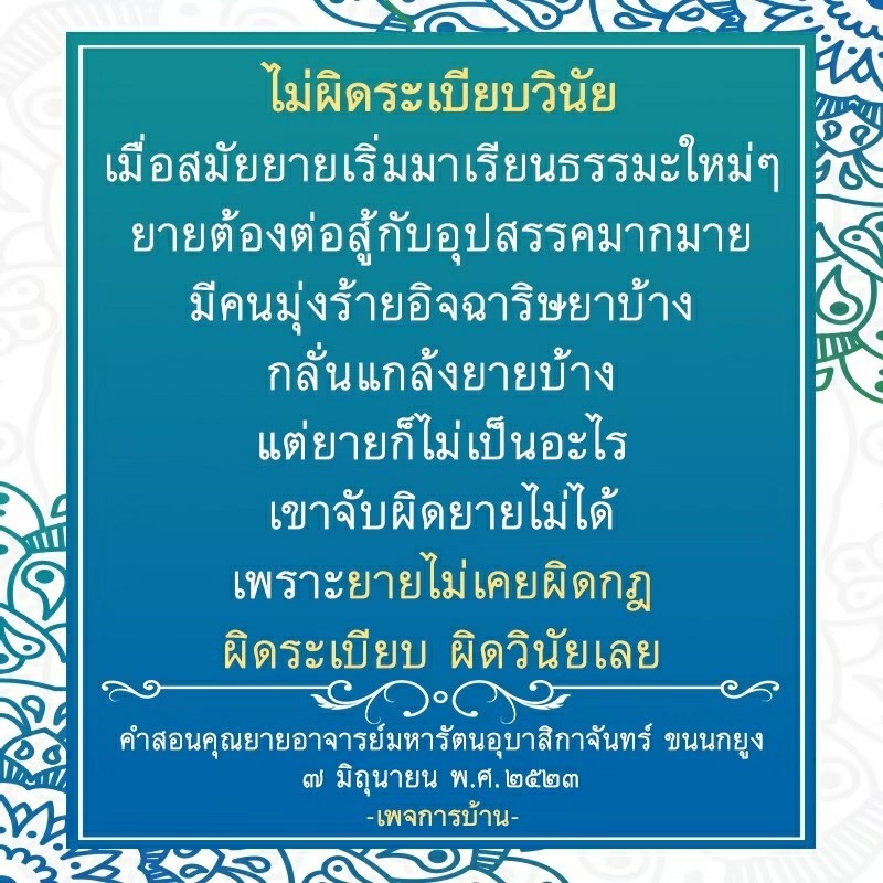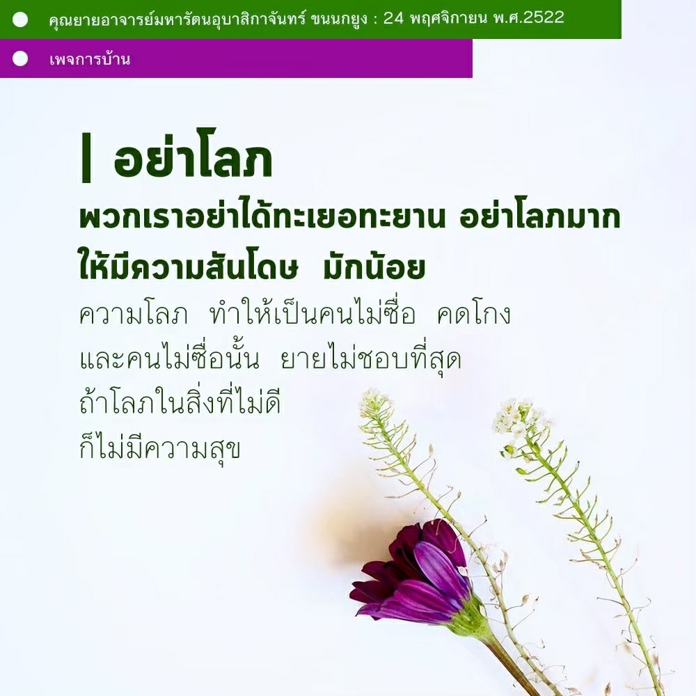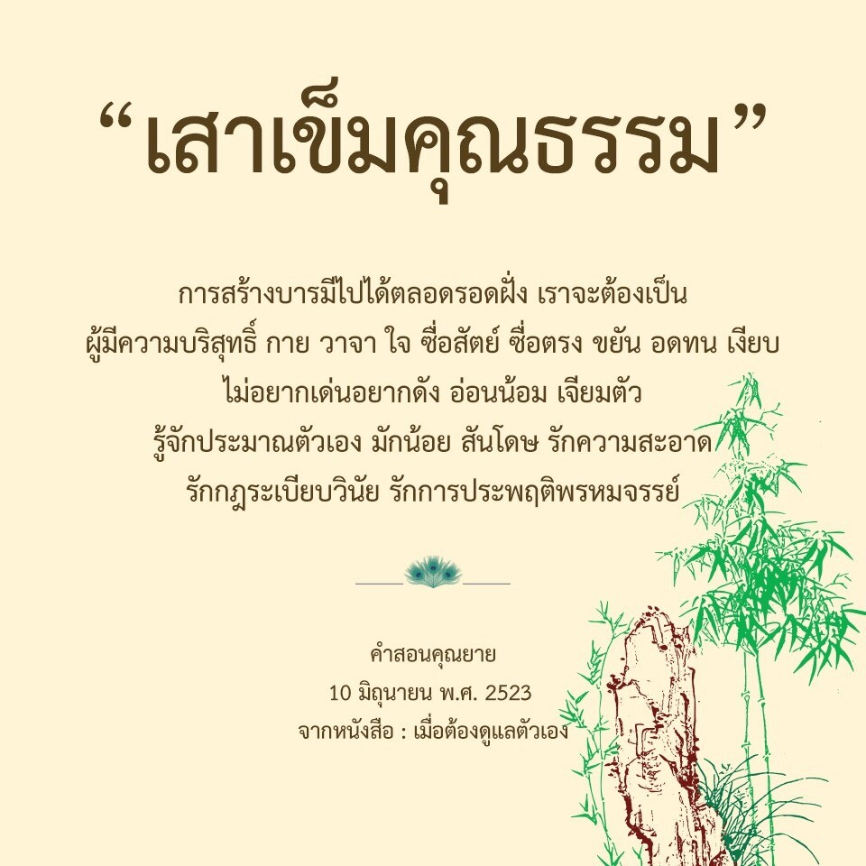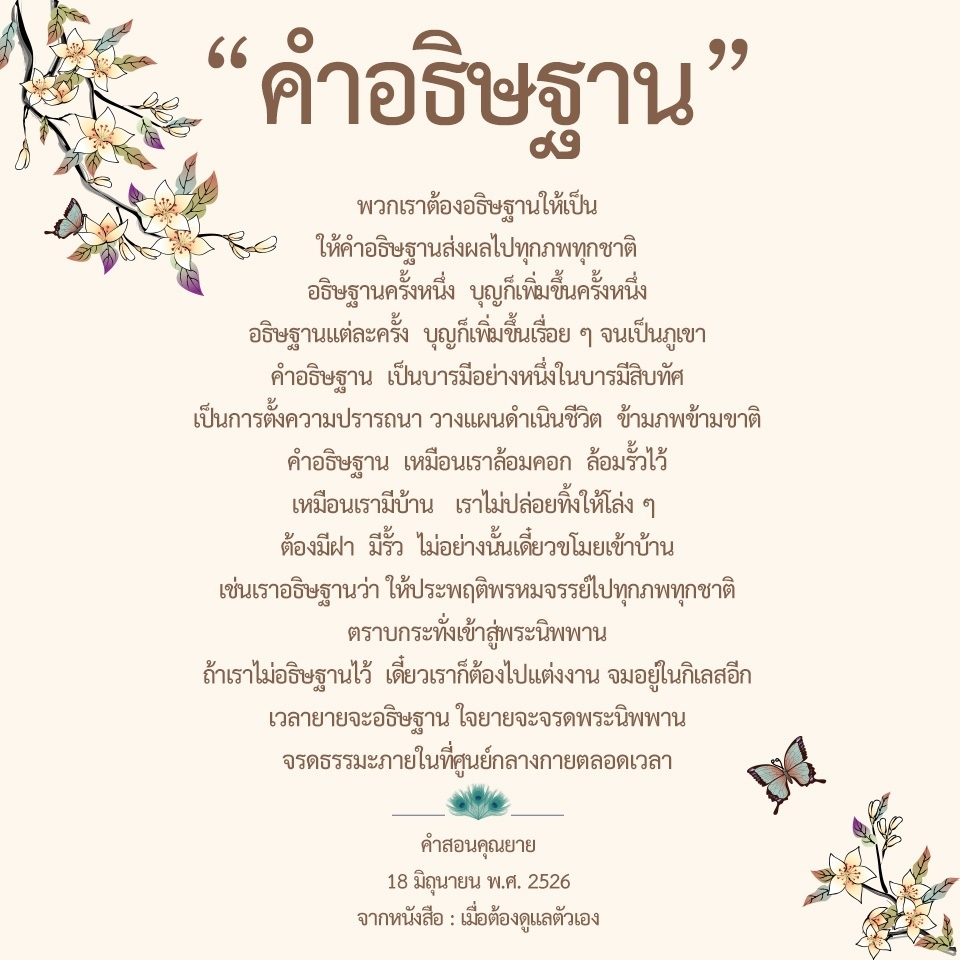 | As I converse with various people, I keep my mind always in its purified state, always centered in merit and in Dhamma. No greed, anger, nor delusions are allowed to defile me.