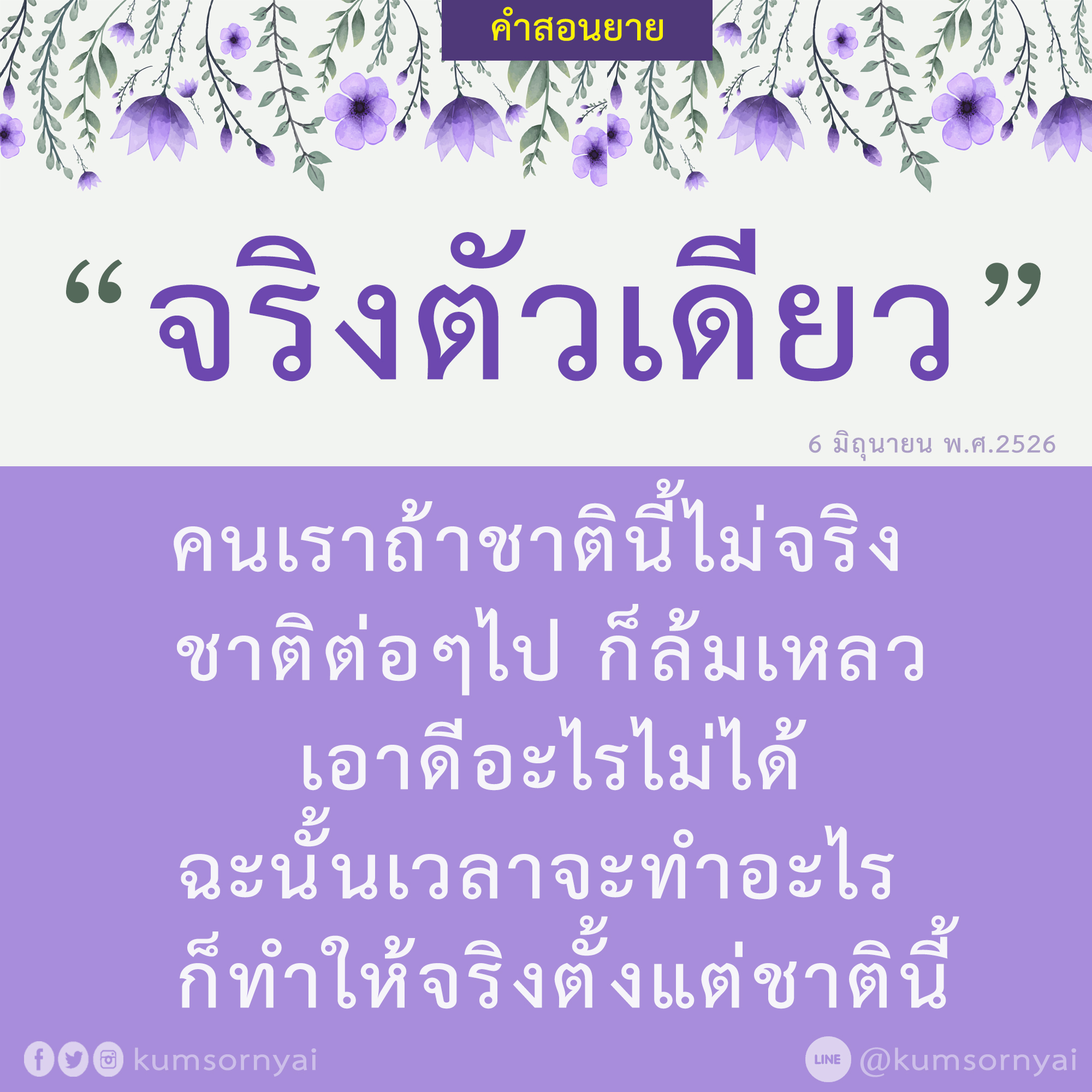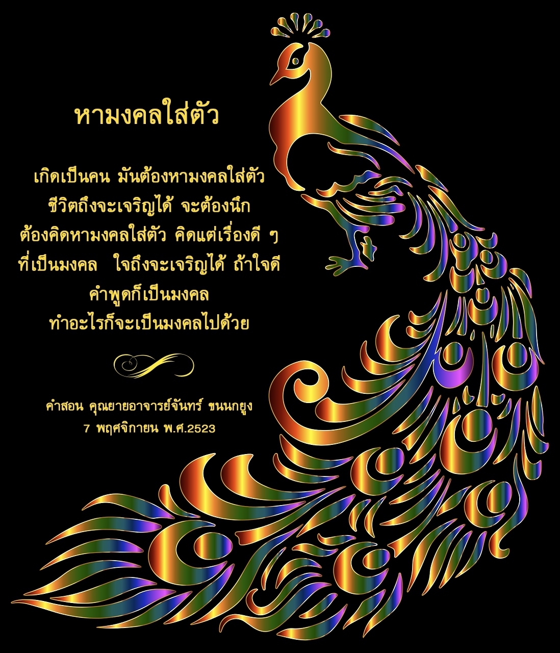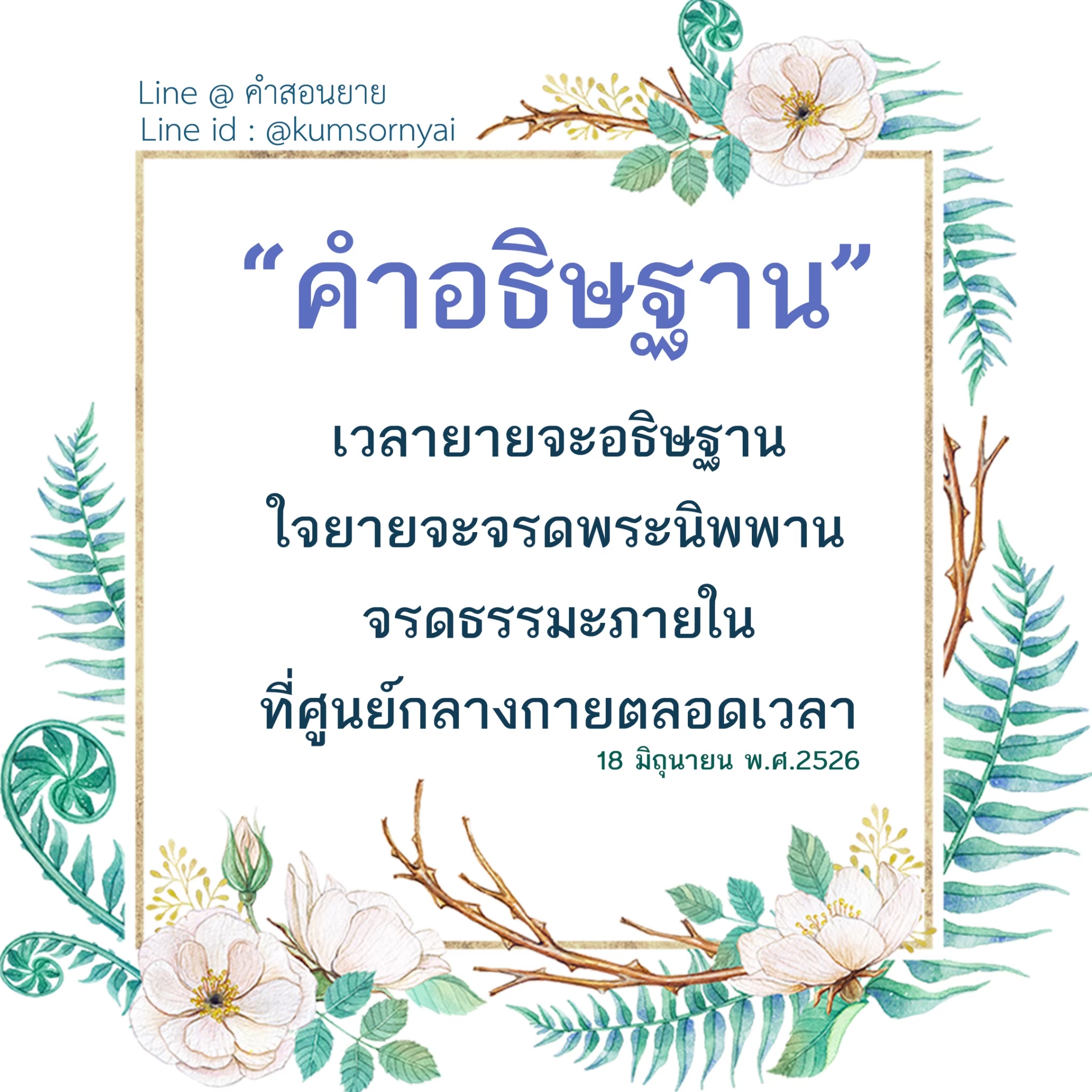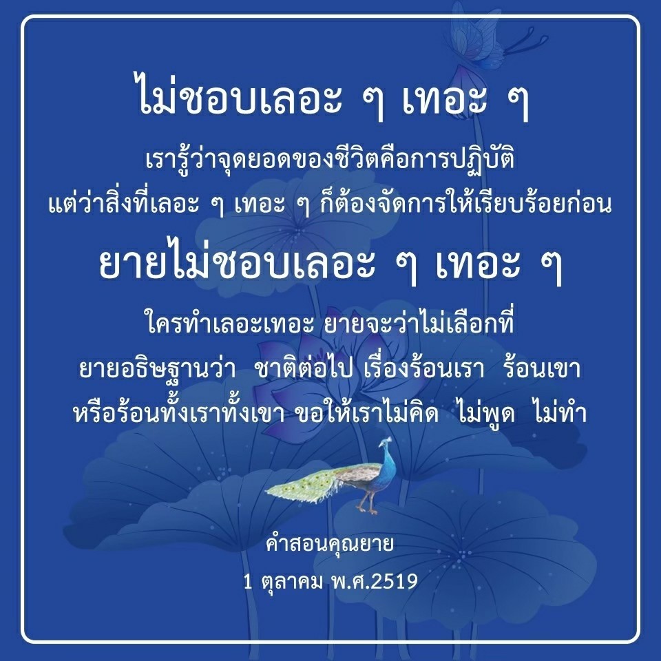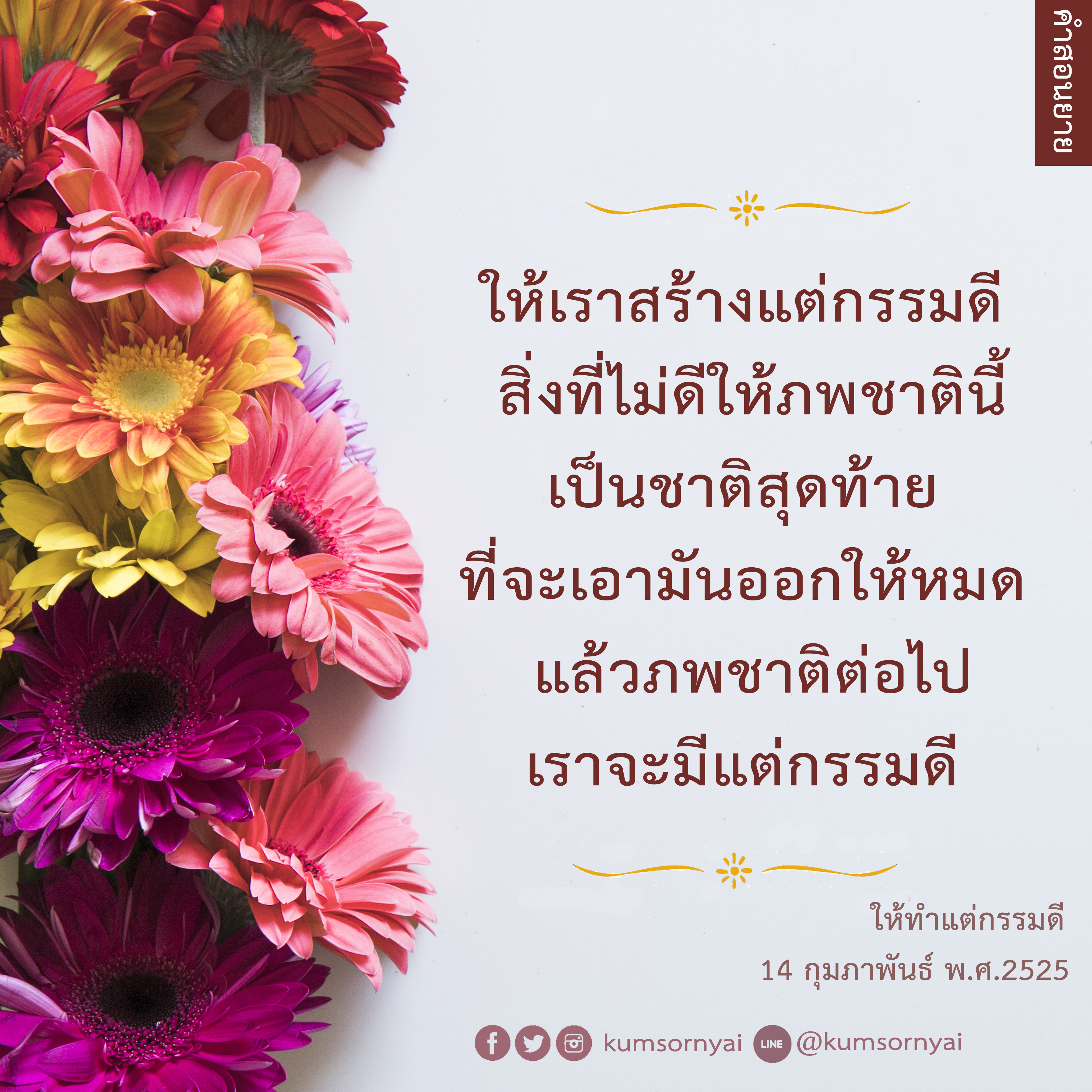 | As I converse with various people, I keep my mind always in its purified state, always centered in merit and in Dhamma. No greed, anger, nor delusions are allowed to defile me.