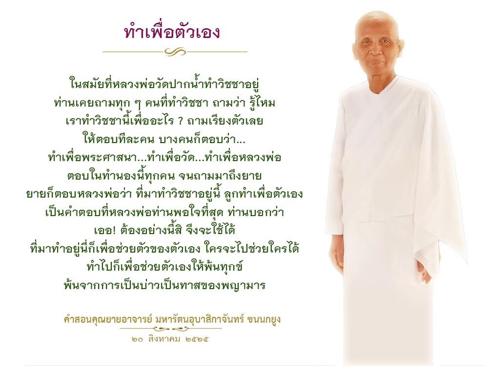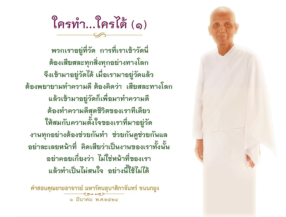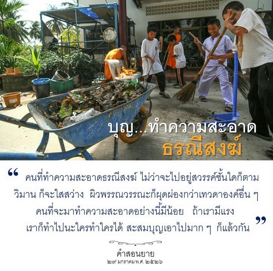 Everything you do in this temple, you do for Buddhism. The work done in this temple belongs to the Lord Buddha. Every chore here, light or heavy, brings you merit. So if there is work to do, help each other finish it so you can find more free time to practice meditation, to read, or to broaden your knowledge so you can become an educated person and be able to relate with others intellectually.
