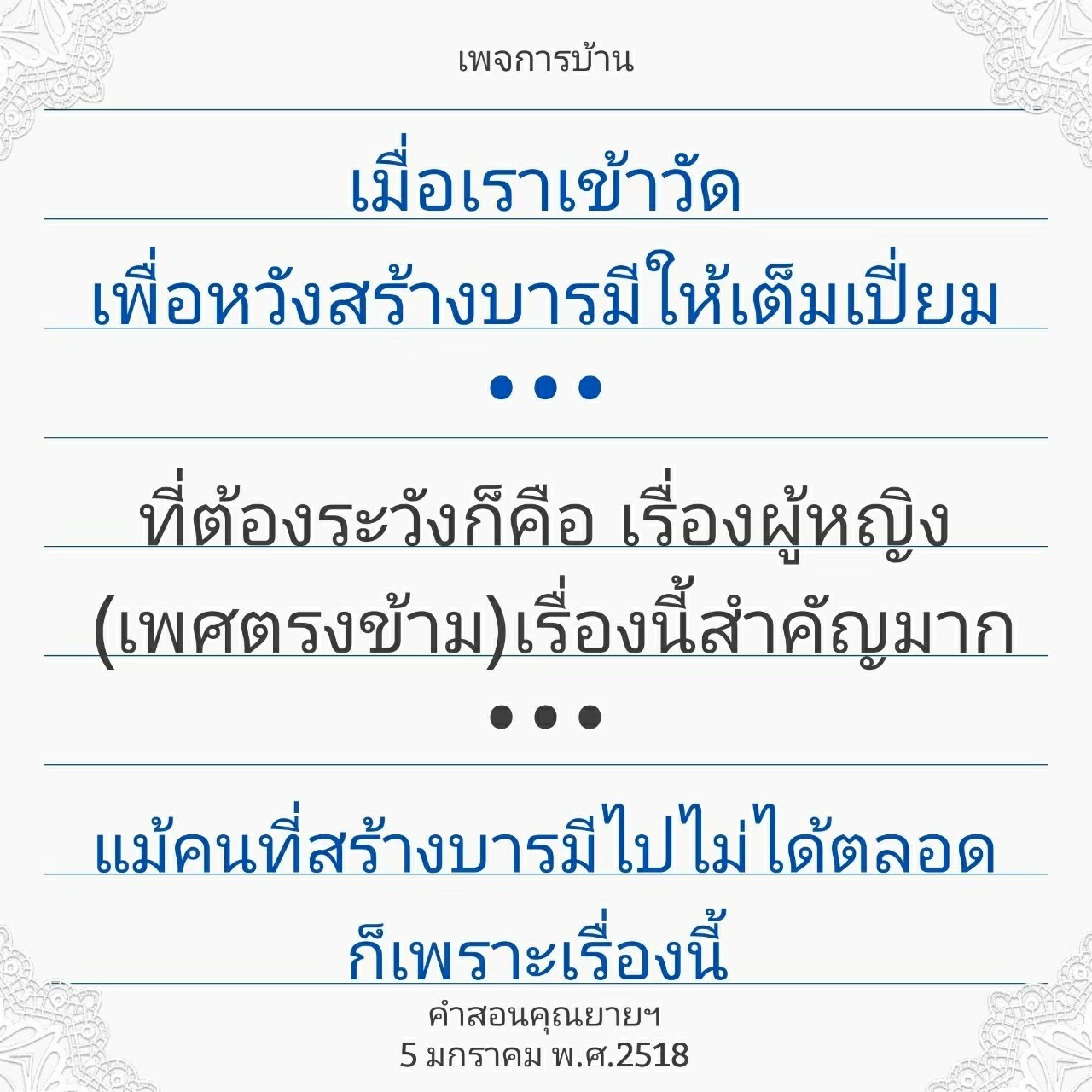 Others, like Khun Yai Thongsuk, who was an excellent teacher and was more proficient in giving sermons than even many educated monks, tried to establish one but she found it too difficult.